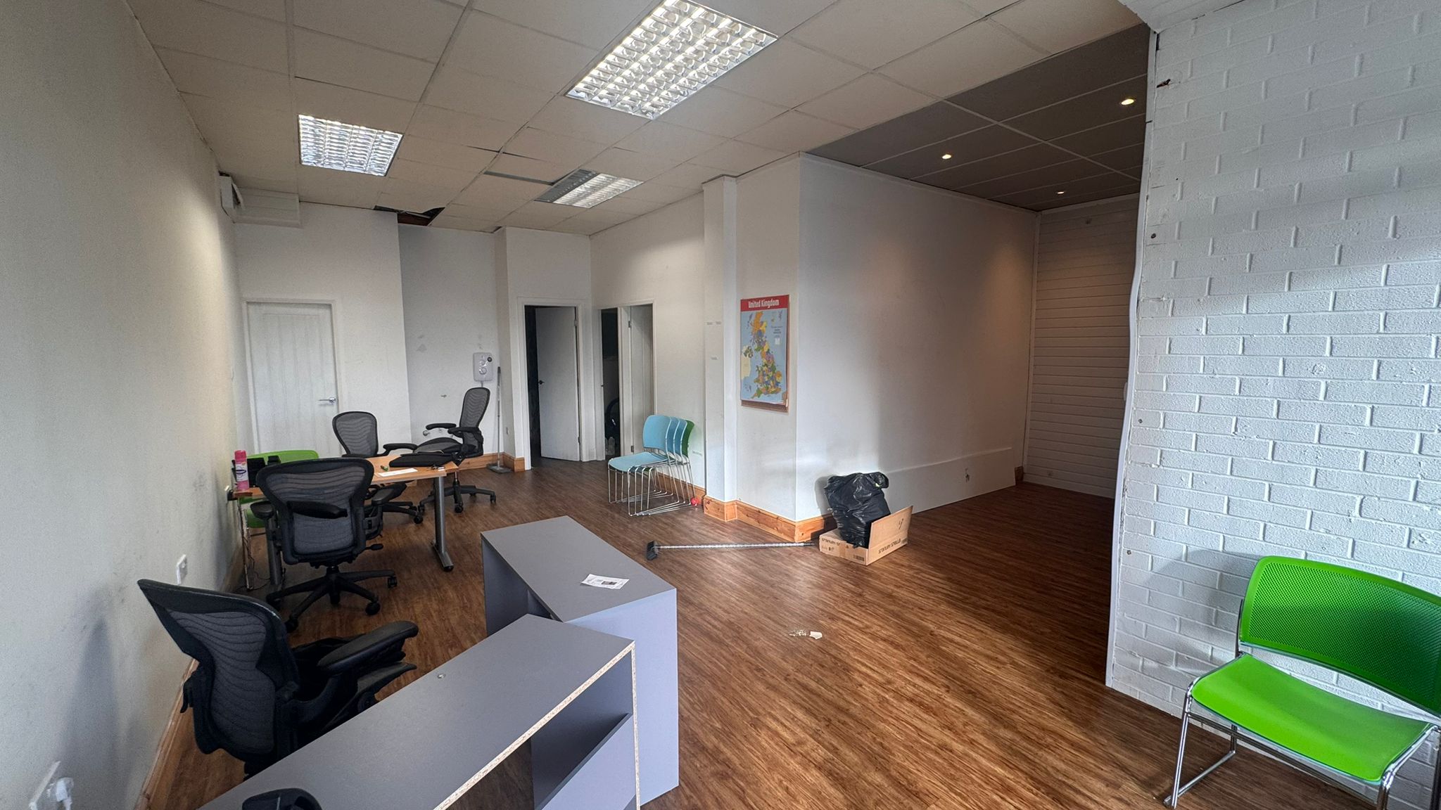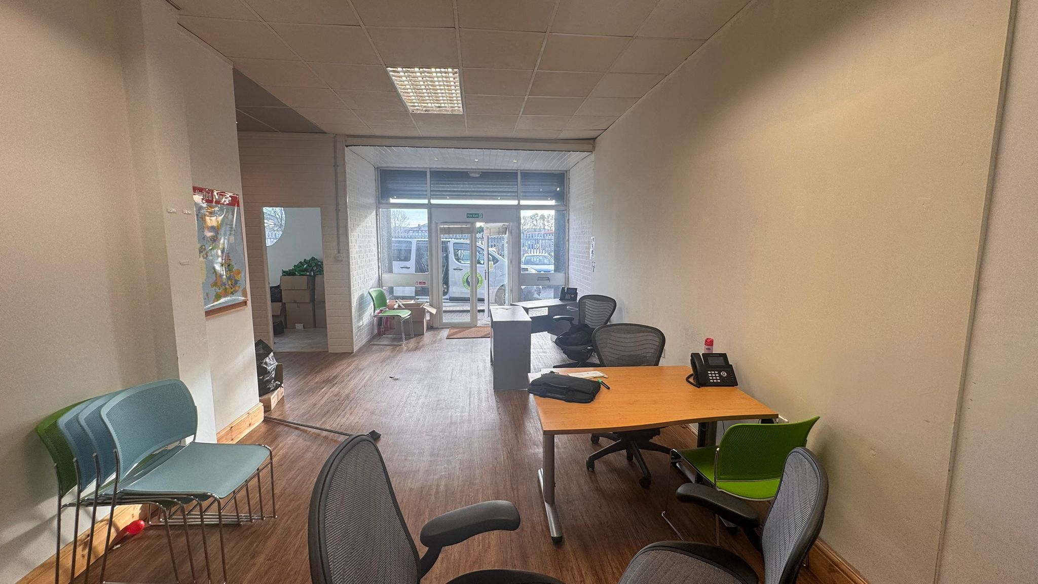 Boasting a total of 761.59 SqFt the unit is comprised of a large open room towards the front with 3 separate office/storage rooms and a kitchen + WC facility at the rear .