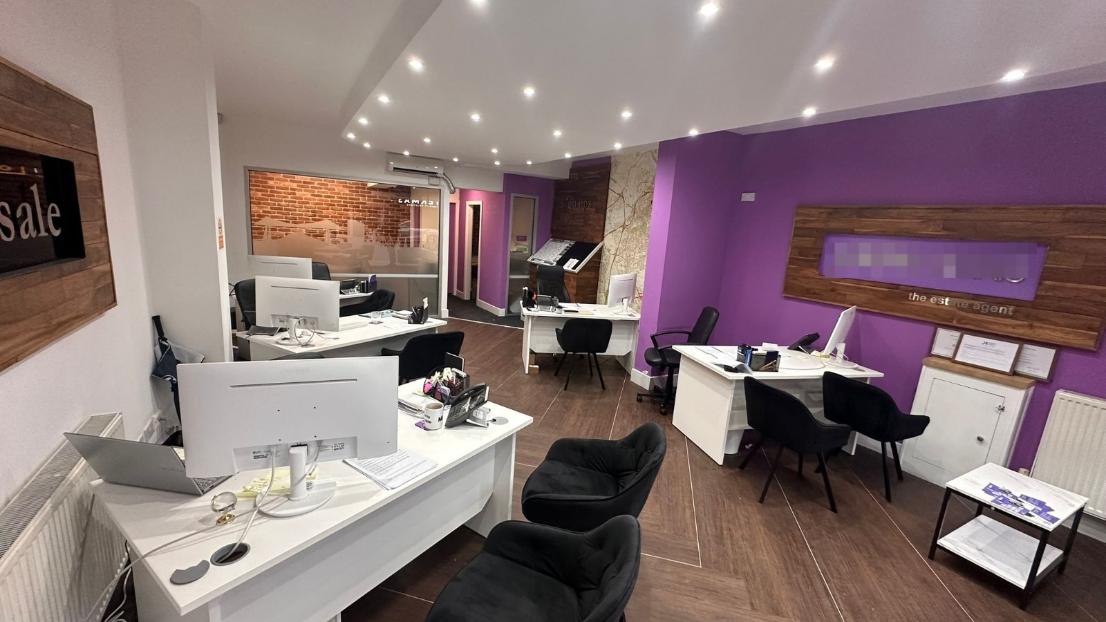Entering through the glass shop front you are welcomed into a large open office space which leads through onto a separate meeting room, storage room, kitchen and WC.